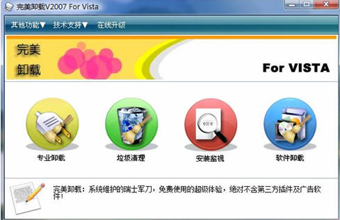 随着微软Vista系统的发布,系统维护成为装机软件的热点。今日,记者获悉,完美卸载V2007 Vista完整版已经面世,这也是自微软Windows Vista发布后,完美卸载软件专门针对Vista的系统维护软件。据了解,完美卸载V2007 Vista版将全面支持Windows Vista系统,并完善了二十多个功能模块,完美结合了专业卸载、垃圾清理、安装监视和网络安全等功能,为进一步提升Vista系统功能和用户的电脑性能提供了保证。